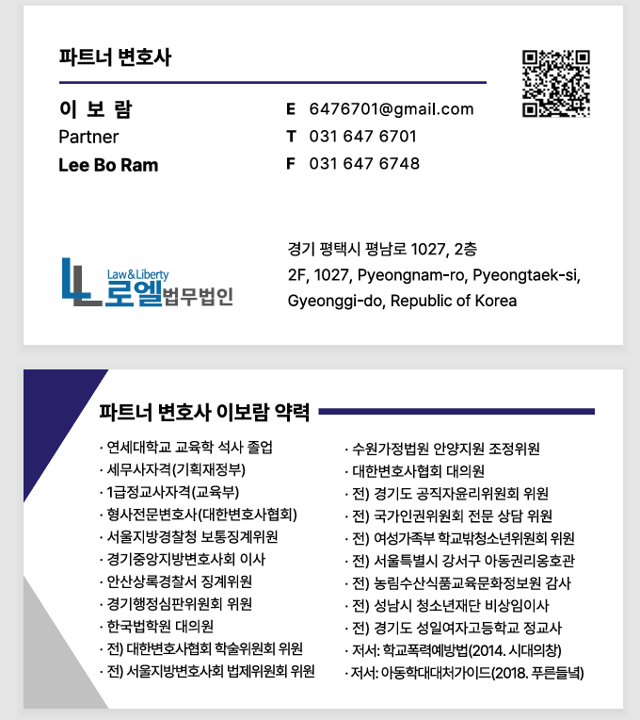 이보람변호사의 교사출신 형사전문변호사, 이혼전문변호사 등 경력에서 알 수 있듯 아청법위반 사건이나, 학교폭력위원회, 가정폭력임시조치접근금지 등 아동, 청소년이나 가정에 관한 법률문제에 능숙합니다. 실제로 교원이나 사회복지시설 신고의무자들을 위한 강의를 많이 하여 왔으며, 관련 서적을 출간할 정도로 많은 연구를 하여 왔습니다.